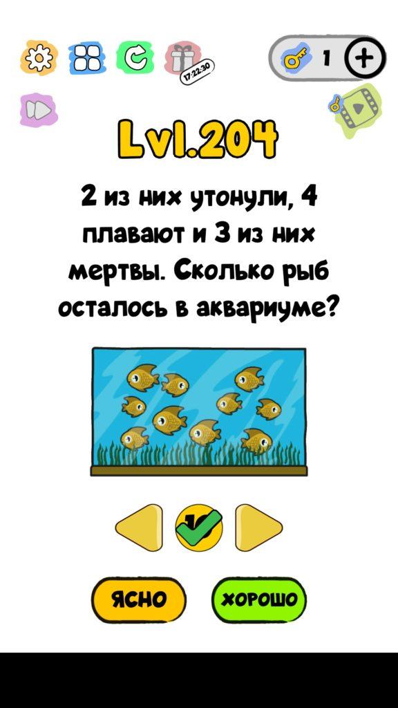 2 из них утонули, 4 плавают и 3 из них мертвы. Сколько рыб осталось в аквариуме? 204 уровень Trick Me: логические головоломки — Это игра созданная в виде викторины. Каждый новый уровень отличается от предыдущего, что делает игровой процесс затягивающим и интересным. Если ты хочешь узнать насколько ты умный, тогда эта игра точно для тебя! Trick Me поможет тебе развить нестандартное мышление, и повысить свой IQ. В этой игре уже есть 236 уровней, которые постоянно обновляются и пополняются. Но если застрял на одном или нескольких уровнях, и не можешь их пройти, то наш сайт придет на помощь, у нас есть все ответы на уровни игры Trick Me.