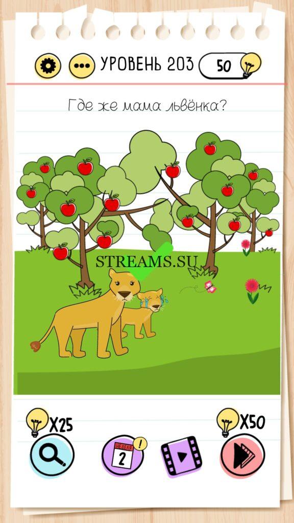 А где мама львёнка? Уровень 203 — Brain Test — Это самая популярная головоломка, в которой вам предстоит разгадывать непростые задачки. Нужно будет искать нестандартные решения. Название игры говорит само за себя (Тест мозга). С её помощью вы сможете повысить свой IQ, и интеллект. Иногда ответ может быть очень прост. Вы можете играть в компании друзей или родных. Брейн Тест, это отличный способ провести время с пользой и узнать насколько ты умный. Но если вы не можете решить один или несколько уровней, то воспользуйтесь подсказками с нашего сайта.