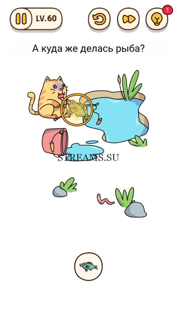 А куда же делась рыба? Уровень 60 — Brain Find – игра для любителей подумать над интересными задачами, ответ на этот уровень находится чуть ниже. Нужно включить собственное остроумие. Эта игра дает возможность увидеть множество локаций и разгадать бесконечное количество ребусов. Каждый отличается друг от друга. Создатели игры – «Focus apps» вложили не только материальные средства, но и всю любовь к игрокам. Ведь в приложении достаточно совершенная прорисовка, радующая глаз. Главным преимуществом является поддержка как Android так и IOS. Нередко бывает, что человек, проходящий уровень, не способен его решить (задача слишком сложна или непонятна). Наш сайт с ответами поможет игроку достичь вершин рейтинга и заполучить все бонусы.
