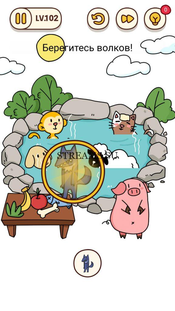 Берегитесь волков! Уровень 102 — Brain Find– уникальная игра в жанре «головоломка», ответ находится чуть ниже. Она имеет множество уровней и подуровней, которые весело проходить, без особых усилий и траты нервов. Игра нравится многим пользователям из-за приятного музыкального ряда, сопровождающегося весь игровой процесс. Тонко выполненной анимации и красивой графики, над которой поработали разработчики и вложили душу. Уникальность проекта состоит в том, что можно поворачивать экран на некоторых заданиях, увеличивать громкость динамика. То есть, всецело взаимодействовать не только с дисплеем, но и со всем мобильным устройством. На данный момент таких игр мало и не все они доступны в бесплатной версии! Brain Find переведена на русский язык. На нашем сайте, можно получить подсказки, если не получается пройти дальше.