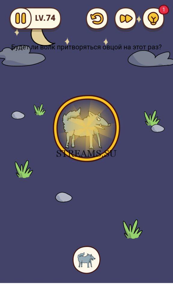 Будет ли волк притворятся овцой на этот раз? Уровень 74 — Brain Find– уникальная игра в жанре «головоломка», ответ находится чуть ниже. Она имеет множество уровней и подуровней, которые весело проходить, без особых усилий и траты нервов. Игра нравится многим пользователям из-за приятного музыкального ряда, сопровождающегося весь игровой процесс. Тонко выполненной анимации и красивой графики, над которой поработали разработчики и вложили душу. Уникальность проекта состоит в том, что можно поворачивать экран на некоторых заданиях, увеличивать громкость динамика. То есть, всецело взаимодействовать не только с дисплеем, но и со всем мобильным устройством. На данный момент таких игр мало и не все они доступны в бесплатной версии! Brain Find переведена на русский язык. На нашем сайте, можно получить подсказки, если не получается пройти дальше.