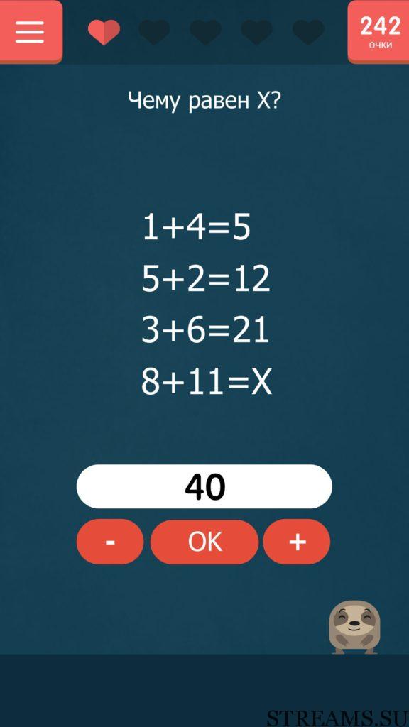 ОТВЕТ: Каждый предыдущий ответ плюсуйте к следующему примеру. Правильный ответ: 40