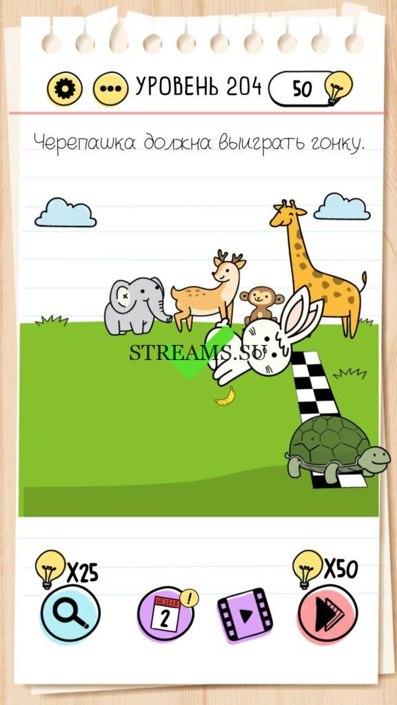 Черепашка должна выиграть гонку. Уровень 204 — Brain Test — Это самая популярная головоломка, в которой вам предстоит разгадывать непростые задачки. Нужно будет искать нестандартные решения. Название игры говорит само за себя (Тест мозга). С её помощью вы сможете повысить свой IQ, и интеллект. Иногда ответ может быть очень прост. Вы можете играть в компании друзей или родных. Брейн Тест, это отличный способ провести время с пользой и узнать насколько ты умный. Но если вы не можете решить один или несколько уровней, то воспользуйтесь подсказками с нашего сайта.