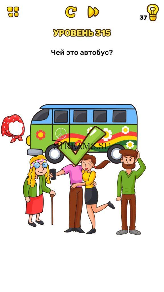 Чей это автобус? Уровень 315 — Brain Blow: Тест на гениальность — Ответ на этот уровень находится под фото. Очередная игра от популярных разработчиков головоломок CASUAL AZUR GAMES. Если вы хотите взорвать свой мозг и развить навыки нестандартного мышления, тогда игра Брейн Блоу определенно вам понравится. Если не получается решить задание, то попробуйте включить нестандартное мышление, тряхнуть телефон, погладить его или использовать больше пальцев. Эта игра способна развить в вас навыки следопыта, креативность и прокачать ваш IQ. Но, а если все-же не получается пройти уровень, найдите правильное решение на нашем сайте.