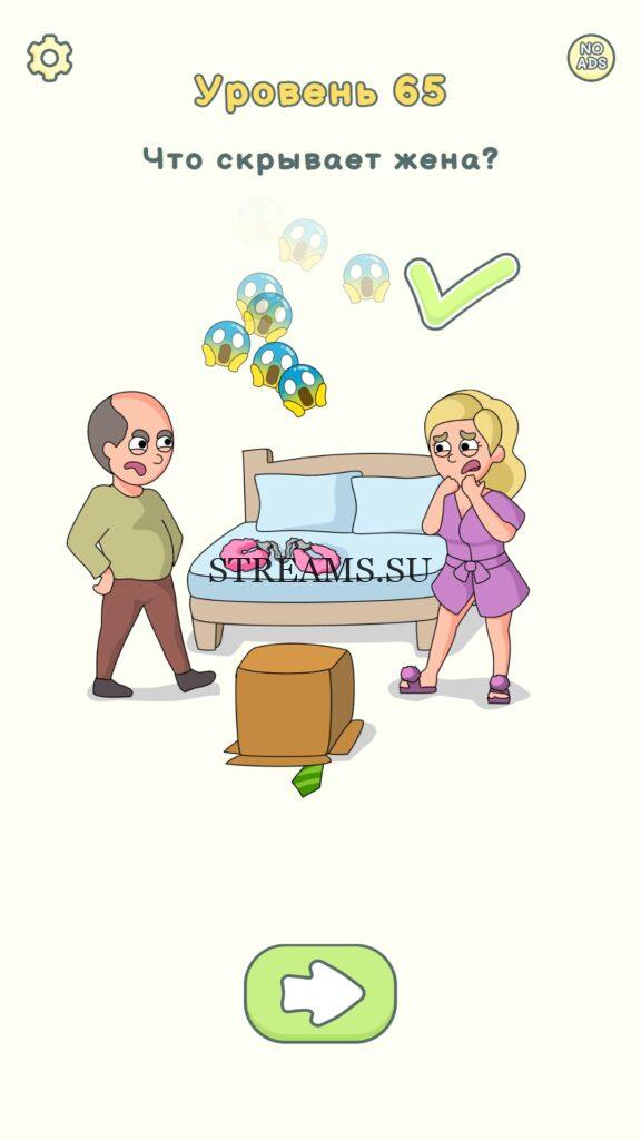 Что скрывает жена? Уровень 65 — DOP 2: Delete One Part. Вы готовы к продолжению первой части игры? Тогда вперед! Эта игра DOP 2 (Расшифровка: Delete One Part) , которая отличается от первой части тем, что здесь нам нужно будет не дорисовывать предметы, а удалять или стирать их. Вас ждет множество хитроумных и интересных уровней. На первом этапе нам будут подсказывать, что нужно удали, но потом становится всё тяжелее и тяжелее решать головоломки. Разработчики постарались сделать игру привлекательной. Геймплей заставит вас просидеть за игрой очень долго. Красивая графика исполнения. Тренировка мозга и многое другое, всё это ждет нас в замечательной головоломке DOP 2. Если не получается пройти уровень, или зашли в тупик, то вы можете найти ответ на любой уровень на нашем сайте STREAMS.SU! Ответ на этот уровень находиться чуть ниже..