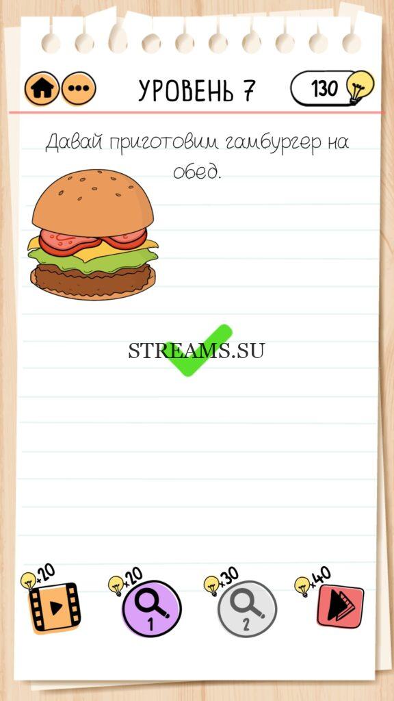 Давай приготовим гамбургер на обед. Уровень 7 — Brain Test 2 (Женина ферма): Вторая часть замечательной игры уже здесь. Готовы к испытанию своего мозга на прочность? Тогда смело залетайте в эту головоломку. Здесь нас ждет непредсказуемые задачки, вопросы и головоломки, которые сразу и не получиться решить. Будьте готовы к вопросам с подвохом! Попробуйте решить все уровни. Эта головоломка построена по принципу историй. В каждой истории придется помогать кому-то решить бытовые вопросы; вычислить преступника; помочь похудеть. Это лишь некоторые эпизоды которые нас ожидают в этой игре. Очень красочная игра, которая понравится и вам и вашим друзьям. Если не получается пройти загадку, то на нашем сайте STREAMS.SU вы найдете решение любого уровня Brain Test 2!