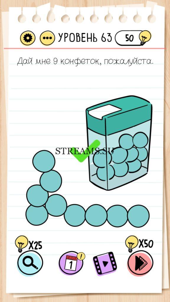Дай мне 9 конфеток, пожалуйста. Уровень 63 — Brain Test — Это самая популярная головоломка, в которой вам предстоит разгадывать непростые задачки. Нужно будет искать нестандартные решения. Название игры говорит само за себя (Тест мозга). С её помощью вы сможете повысить свой IQ, и интеллект. Иногда ответ может быть очень прост. Вы можете играть в компании друзей или родных. Брейн Тест, это отличный способ провести время с пользой и узнать насколько ты умный. Но если вы не можете решить один или несколько уровней, то воспользуйтесь подсказками с нашего сайта.