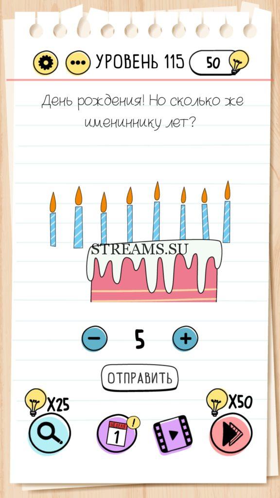 День рождения! Но сколько же имениннику лет? Уровень 115 — Brain Test— Это самая популярная головоломка, в которой вам предстоит разгадывать непростые задачки. Нужно будет искать нестандартные решения. Название игры говорит само за себя (Тест мозга). С её помощью вы сможете повысить свой IQ, и интеллект. Иногда ответ может быть очень прост. Вы можете играть в компании друзей или родных. Брейн Тест, это отличный способ провести время с пользой и узнать насколько ты умный. Но если вы не можете решить один или несколько уровней, то воспользуйтесь подсказками с нашего сайта.