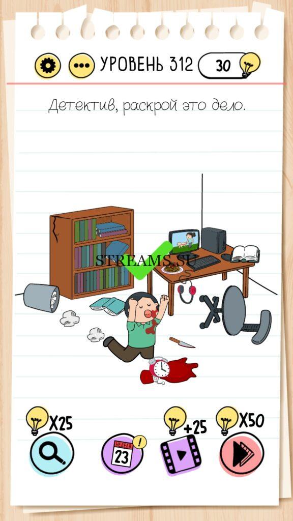 Детектив, раскрой это дело. Уровень 312 — Brain Test — Это самая популярная головоломка, в которой вам предстоит разгадывать непростые задачки. Нужно будет искать нестандартные решения. Название игры говорит само за себя (Тест мозга). С её помощью вы сможете повысить свой IQ, и интеллект. Иногда ответ может быть очень прост. Вы можете играть в компании друзей или родных. Брейн Тест, это отличный способ провести время с пользой и узнать насколько ты умный. Но если вы не можете решить один или несколько уровней, то воспользуйтесь подсказками с нашего сайта.