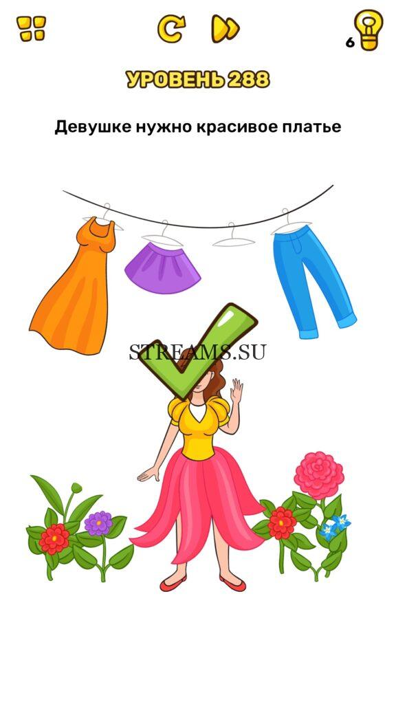 Девушке нужно красивое платье. Уровень 288 — Brain Blow: Тест на гениальность — Ответ на этот уровень находится под фото. Очередная игра от популярных разработчиков головоломок CASUAL AZUR GAMES. Если вы хотите взорвать свой мозг и развить навыки нестандартного мышления, тогда игра Брейн Блоу определенно вам понравится. Если не получается решить задание, то попробуйте включить нестандартное мышление, тряхнуть телефон, погладить его или использовать больше пальцев. Эта игра способна развить в вас навыки следопыта, креативность и прокачать ваш IQ. Но, а если все-же не получается пройти уровень, найдите правильное решение на нашем сайте.