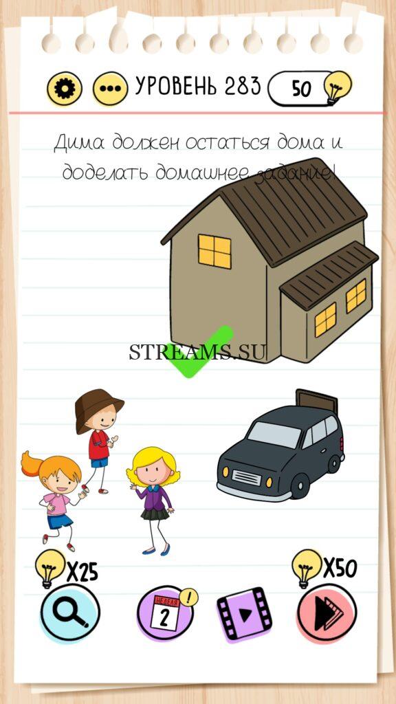 Дима должен остаться дома и доделать домашнее задание! Уровень 283 — Brain Test — Это самая популярная головоломка, в которой вам предстоит разгадывать непростые задачки. Нужно будет искать нестандартные решения. Название игры говорит само за себя (Тест мозга). С её помощью вы сможете повысить свой IQ, и интеллект. Иногда ответ может быть очень прост. Вы можете играть в компании друзей или родных. Брейн Тест, это отличный способ провести время с пользой и узнать насколько ты умный. Но если вы не можете решить один или несколько уровней, то воспользуйтесь подсказками с нашего сайта.