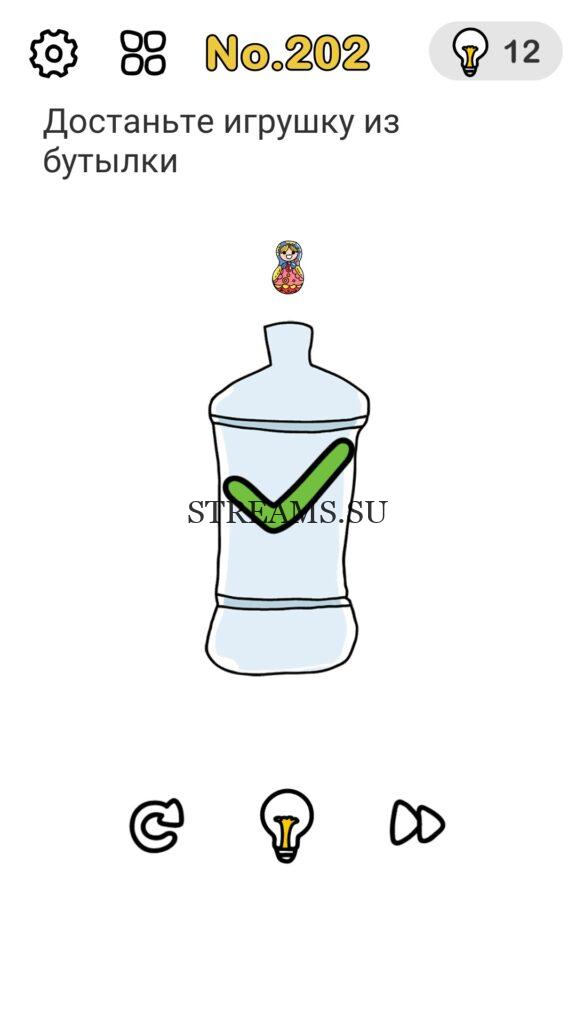 Достаньте игрушку из бутылки. Уровень 202 — Brain Out: Ответ на этот уровень находится чуть ниже. Всегда было интересно узнать каков твой IQ? Эта игра поможет тебе узнать ответ на этот вопрос! В ней встречаются как логические загадки, так и не очень. С помощью этой интересной головоломки вы сможете развить нестандартное мышление, креативность, воображение а также улучшить способность запоминать. Некоторые решения задач, могут показаться абсурдными. Играйте в Brain Out с друзьями и родственниками. А если у вас не получается пройти один или несколько уровней, вы можете воспользоваться подсказками с нашего сайта.