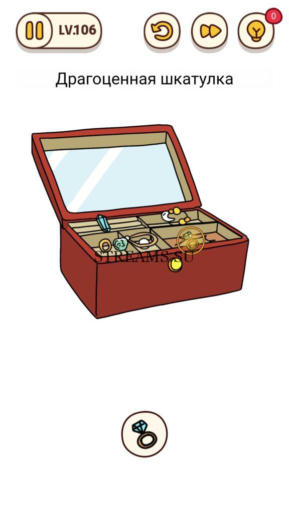 Драгоценная шкатулка. Уровень 106 — Brain Find – уникальная игра в жанре «головоломка», ответ находится чуть ниже. Она имеет множество уровней и подуровней, которые весело проходить, без особых усилий и траты нервов. Игра нравится многим пользователям из-за приятного музыкального ряда, сопровождающегося весь игровой процесс. Тонко выполненной анимации и красивой графики, над которой поработали разработчики и вложили душу. Уникальность проекта состоит в том, что можно поворачивать экран на некоторых заданиях, увеличивать громкость динамика. То есть, всецело взаимодействовать не только с дисплеем, но и со всем мобильным устройством. На данный момент таких игр мало и не все они доступны в бесплатной версии! Brain Find переведена на русский язык. На нашем сайте, можно получить подсказки, если не получается пройти дальше.