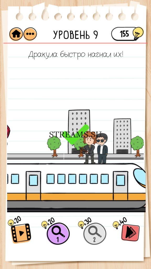Дракула быстро нагнал их! Уровень 9 — Brain Test 2 (Беймс Джонд и Ваня. Часть 2): Вторая часть замечательной игры уже здесь. Готовы к испытанию своего мозга на прочность? Тогда смело залетайте в эту головоломку. Здесь нас ждет непредсказуемые задачки, вопросы и головоломки, которые сразу и не получиться решить. Будьте готовы к вопросам с подвохом! Попробуйте решить все уровни. Эта головоломка построена по принципу историй. В каждой истории придется помогать кому-то решить бытовые вопросы; вычислить преступника; помочь похудеть. Это лишь некоторые эпизоды которые нас ожидают в этой игре. Очень красочная игра, которая понравится и вам и вашим друзьям. Если не получается пройти загадку, то на нашем сайте STREAMS.SU вы найдете решение любого уровня Brain Test 2!