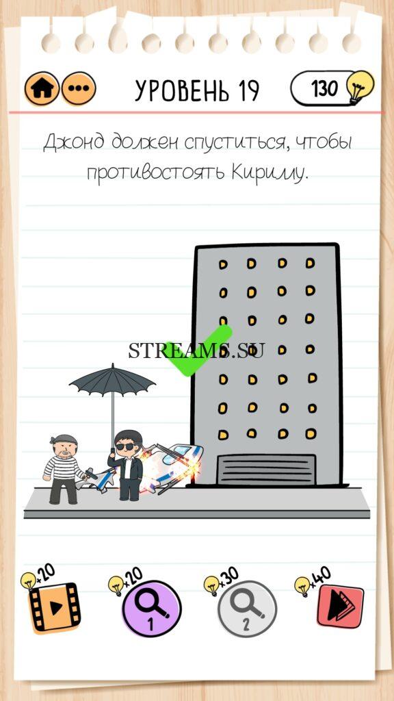 Джонд должен спуститься, чтобы противостоять Кириллу. Уровень 19 — Brain Test 2 (Агент Беймс Джонд): Вторая часть замечательной игры уже здесь. Готовы к испытанию своего мозга на прочность? Тогда смело залетайте в эту головоломку. Здесь нас ждет непредсказуемые задачки, вопросы и головоломки, которые сразу и не получиться решить. Будьте готовы к вопросам с подвохом! Попробуйте решить все уровни. Эта головоломка построена по принципу историй. В каждой истории придется помогать кому-то решить бытовые вопросы; вычислить преступника; помочь похудеть. Это лишь некоторые эпизоды которые нас ожидают в этой игре. Очень красочная игра, которая понравится и вам и вашим друзьям. Если не получается пройти загадку, то на нашем сайте STREAMS.SU вы найдете решение любого уровня Brain Test 2!