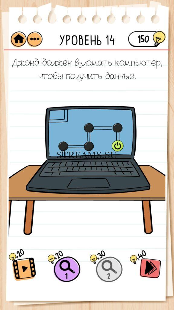 Джонд должен взломать компьютер, чтобы получить данные. Уровень 14 — Brain Test 2 (Агент Беймс Джонд): Вторая часть замечательной игры уже здесь. Готовы к испытанию своего мозга на прочность? Тогда смело залетайте в эту головоломку. Здесь нас ждет непредсказуемые задачки, вопросы и головоломки, которые сразу и не получиться решить. Будьте готовы к вопросам с подвохом! Попробуйте решить все уровни. Эта головоломка построена по принципу историй. В каждой истории придется помогать кому-то решить бытовые вопросы; вычислить преступника; помочь похудеть. Это лишь некоторые эпизоды которые нас ожидают в этой игре. Очень красочная игра, которая понравится и вам и вашим друзьям. Если не получается пройти загадку, то на нашем сайте STREAMS.SU вы найдете решение любого уровня Brain Test 2!