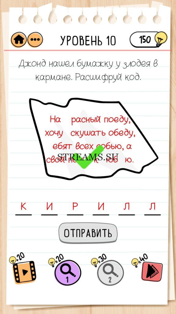 Джонд нашел бумажку у злодея в кармане. Расшифруй код. Уровень 10 — Brain Test 2 (Агент Беймс Джонд): Вторая часть замечательной игры уже здесь. Готовы к испытанию своего мозга на прочность? Тогда смело залетайте в эту головоломку. Здесь нас ждет непредсказуемые задачки, вопросы и головоломки, которые сразу и не получиться решить. Будьте готовы к вопросам с подвохом! Попробуйте решить все уровни. Эта головоломка построена по принципу историй. В каждой истории придется помогать кому-то решить бытовые вопросы; вычислить преступника; помочь похудеть. Это лишь некоторые эпизоды которые нас ожидают в этой игре. Очень красочная игра, которая понравится и вам и вашим друзьям. Если не получается пройти загадку, то на нашем сайте STREAMS.SU вы найдете решение любого уровня Brain Test 2!