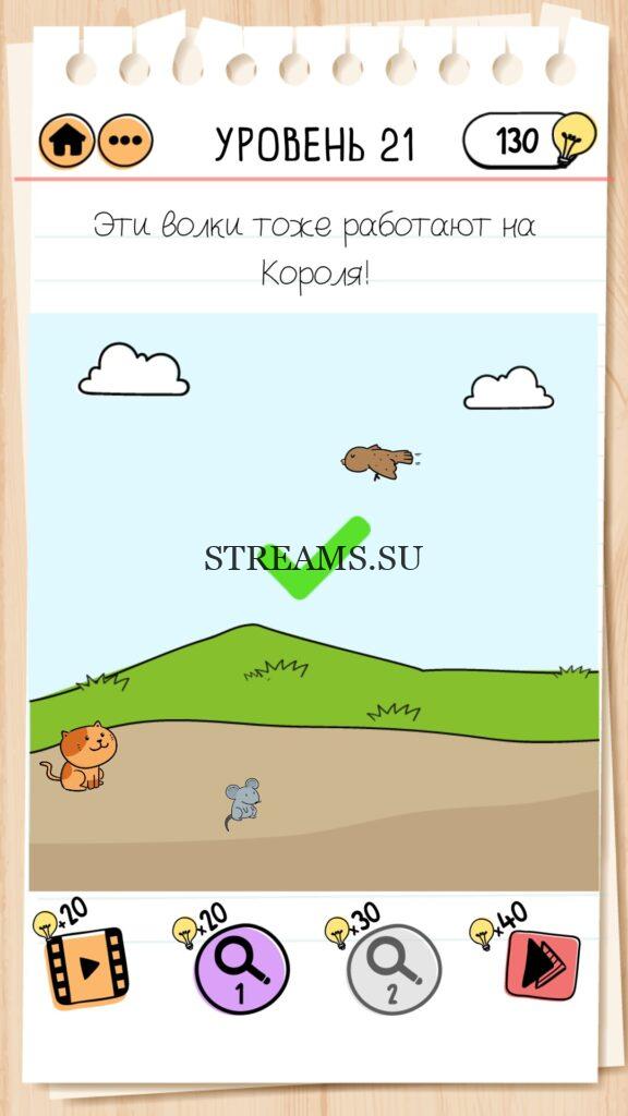Эти волки тоже работают на Короля! Уровень 21 — Brain Test 2 (Приключения Васьки): Вторая часть замечательной игры уже здесь. Готовы к испытанию своего мозга на прочность? Тогда смело залетайте в эту головоломку. Здесь нас ждет непредсказуемые задачки, вопросы и головоломки, которые сразу и не получиться решить. Будьте готовы к вопросам с подвохом! Попробуйте решить все уровни. Эта головоломка построена по принципу историй. В каждой истории придется помогать кому-то решить бытовые вопросы; вычислить преступника; помочь похудеть. Это лишь некоторые эпизоды которые нас ожидают в этой игре. Очень красочная игра, которая понравится и вам и вашим друзьям. Если не получается пройти загадку, то на нашем сайте STREAMS.SU вы найдете решение любого уровня Brain Test 2!