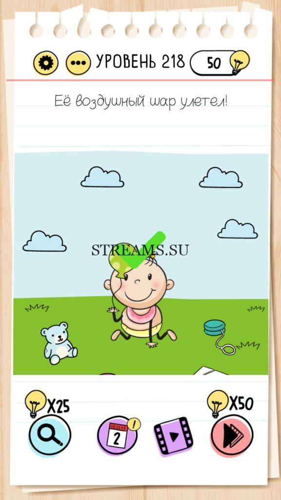 Её воздушный шар улетел! Уровень 218 — Brain Test — Это самая популярная головоломка, в которой вам предстоит разгадывать непростые задачки. Нужно будет искать нестандартные решения. Название игры говорит само за себя (Тест мозга). С её помощью вы сможете повысить свой IQ, и интеллект. Иногда ответ может быть очень прост. Вы можете играть в компании друзей или родных. Брейн Тест, это отличный способ провести время с пользой и узнать насколько ты умный. Но если вы не можете решить один или несколько уровней, то воспользуйтесь подсказками с нашего сайта.