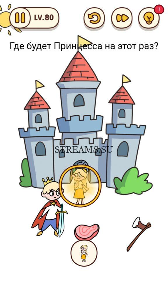 Где будет Принцесса на этот раз? Уровень 80 — Brain Find– уникальная игра в жанре «головоломка», ответ находится чуть ниже. Она имеет множество уровней и подуровней, которые весело проходить, без особых усилий и траты нервов. Игра нравится многим пользователям из-за приятного музыкального ряда, сопровождающегося весь игровой процесс. Тонко выполненной анимации и красивой графики, над которой поработали разработчики и вложили душу. Уникальность проекта состоит в том, что можно поворачивать экран на некоторых заданиях, увеличивать громкость динамика. То есть, всецело взаимодействовать не только с дисплеем, но и со всем мобильным устройством. На данный момент таких игр мало и не все они доступны в бесплатной версии! Brain Find переведена на русский язык. На нашем сайте, можно получить подсказки, если не получается пройти дальше.