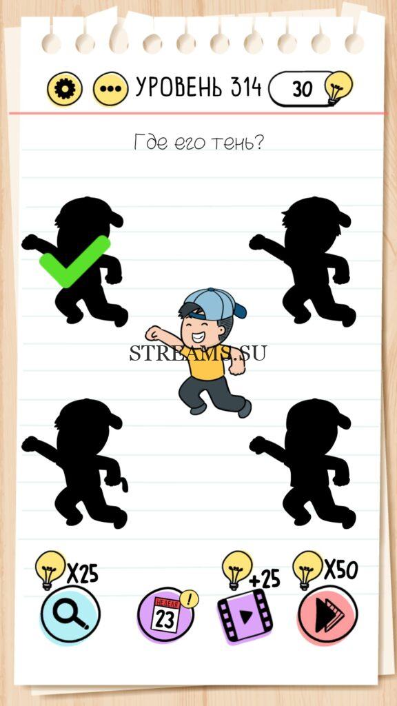 Где его тень? Уровень 314 — Brain Test — Это самая популярная головоломка, в которой вам предстоит разгадывать непростые задачки. Нужно будет искать нестандартные решения. Название игры говорит само за себя (Тест мозга). С её помощью вы сможете повысить свой IQ, и интеллект. Иногда ответ может быть очень прост. Вы можете играть в компании друзей или родных. Брейн Тест, это отличный способ провести время с пользой и узнать насколько ты умный. Но если вы не можете решить один или несколько уровней, то воспользуйтесь подсказками с нашего сайта.