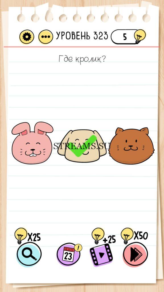 Где кролик? Уровень 323 — Brain Test— Это самая популярная головоломка, в которой вам предстоит разгадывать непростые задачки. Нужно будет искать нестандартные решения. Название игры говорит само за себя (Тест мозга). С её помощью вы сможете повысить свой IQ, и интеллект. Иногда ответ может быть очень прост. Вы можете играть в компании друзей или родных. Брейн Тест, это отличный способ провести время с пользой и узнать насколько ты умный. Но если вы не можете решить один или несколько уровней, то воспользуйтесь подсказками с нашего сайта.