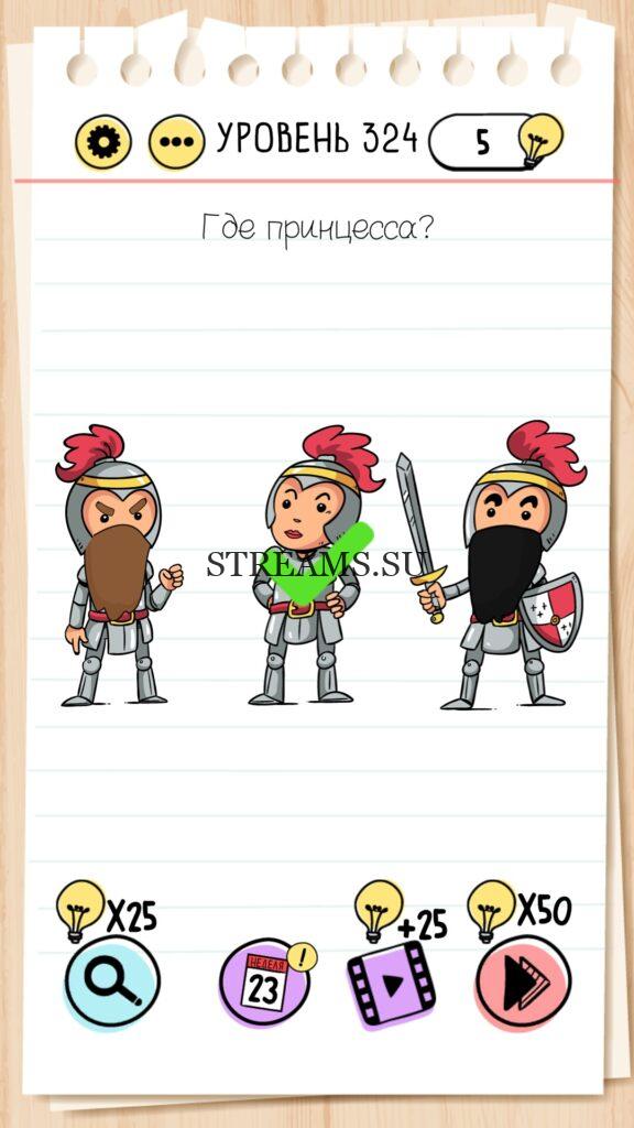 Где принцесса? Уровень 324 — Brain Test— Это самая популярная головоломка, в которой вам предстоит разгадывать непростые задачки. Нужно будет искать нестандартные решения. Название игры говорит само за себя (Тест мозга). С её помощью вы сможете повысить свой IQ, и интеллект. Иногда ответ может быть очень прост. Вы можете играть в компании друзей или родных. Брейн Тест, это отличный способ провести время с пользой и узнать насколько ты умный. Но если вы не можете решить один или несколько уровней, то воспользуйтесь подсказками с нашего сайта.