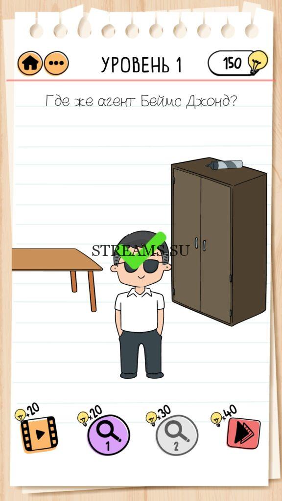 Где же агент Беймс Джонд? Уровень 1 — Brain Test 2 (Агент Беймс Джонд): Вторая часть замечательной игры уже здесь. Готовы к испытанию своего мозга на прочность? Тогда смело залетайте в эту головоломку. Здесь нас ждет непредсказуемые задачки, вопросы и головоломки, которые сразу и не получиться решить. Будьте готовы к вопросам с подвохом! Попробуйте решить все уровни. Эта головоломка построена по принципу историй. В каждой истории придется помогать кому-то решить бытовые вопросы; вычислить преступника; помочь похудеть. Это лишь некоторые эпизоды которые нас ожидают в этой игре. Очень красочная игра, которая понравится и вам и вашим друзьям. Если не получается пройти загадку, то на нашем сайте STREAMS.SU вы найдете решение любого уровня Brain Test 2!