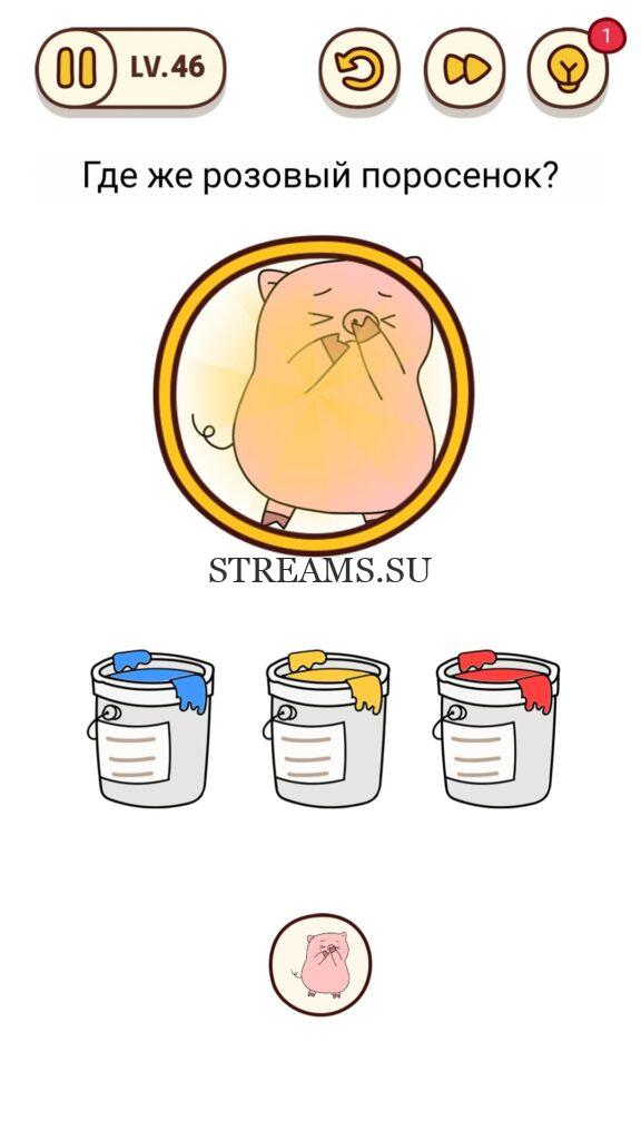 Где же розовый поросенок? Уровень 46 — Brain Find – игра для любителей подумать над интересными задачами, ответ на этот уровень находится чуть ниже. Нужно включить собственное остроумие. Эта игра дает возможность увидеть множество локаций и разгадать бесконечное количество ребусов. Каждый отличается друг от друга. Создатели игры – «Focus apps» вложили не только материальные средства, но и всю любовь к игрокам. Ведь в приложении достаточно совершенная прорисовка, радующая глаз. Главным преимуществом является поддержка как Android так и IOS. Нередко бывает, что человек, проходящий уровень, не способен его решить (задача слишком сложна или непонятна). Наш сайт с ответами поможет игроку достичь вершин рейтинга и заполучить все бонусы.