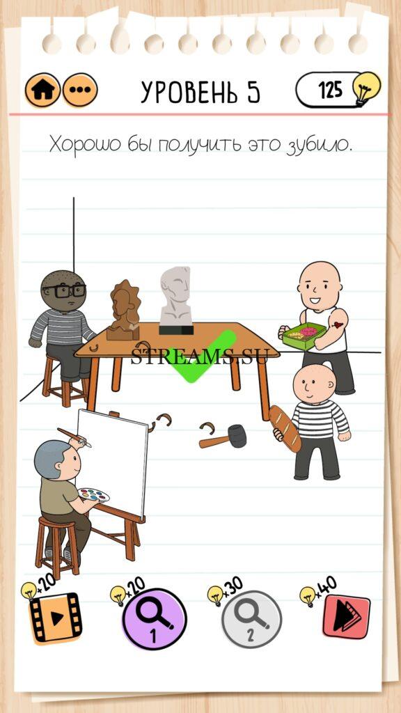 Хорошо бы получить это зубило. Уровень 5 — Brain Test 2 (Побег из тюрьмы): Вторая часть замечательной игры уже здесь. Готовы к испытанию своего мозга на прочность? Тогда смело залетайте в эту головоломку. Здесь нас ждет непредсказуемые задачки, вопросы и головоломки, которые сразу и не получиться решить. Будьте готовы к вопросам с подвохом! Попробуйте решить все уровни. Эта головоломка построена по принципу историй. В каждой истории придется помогать кому-то решить бытовые вопросы; вычислить преступника; помочь похудеть. Это лишь некоторые эпизоды которые нас ожидают в этой игре. Очень красочная игра, которая понравится и вам и вашим друзьям. Если не получается пройти загадку, то на нашем сайте STREAMS.SU вы найдете решение любого уровня Brain Test 2!