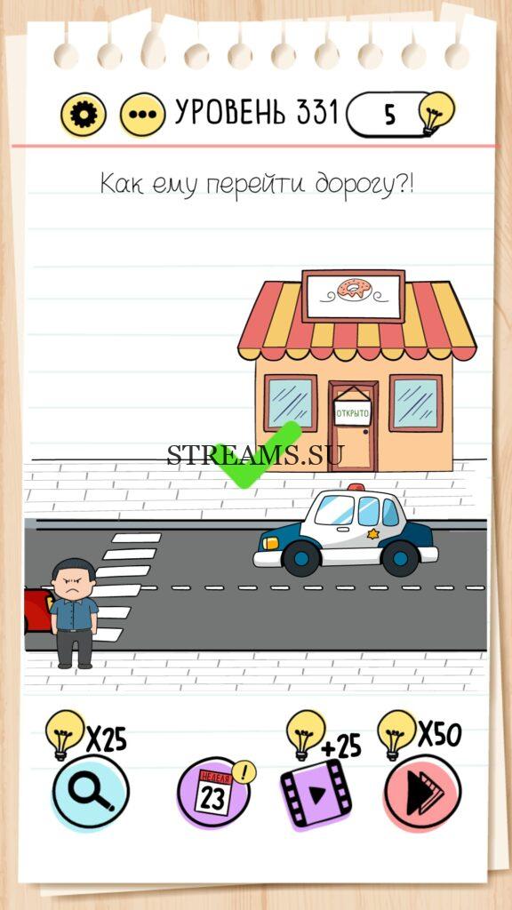 Как ему перейти дорогу? Уровень 331 — Brain Test — Это самая популярная головоломка, в которой вам предстоит разгадывать непростые задачки. Нужно будет искать нестандартные решения. Название игры говорит само за себя (Тест мозга). С её помощью вы сможете повысить свой IQ, и интеллект. Иногда ответ может быть очень прост. Вы можете играть в компании друзей или родных. Брейн Тест, это отличный способ провести время с пользой и узнать насколько ты умный. Но если вы не можете решить один или несколько уровней, то воспользуйтесь подсказками с нашего сайта.