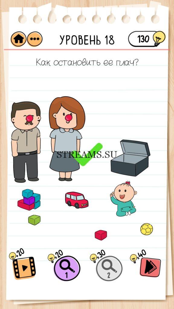 Как остановить её плач? Уровень 18 — Brain Test 2 (Семья Всезнайкиных): Вторая часть замечательной игры уже здесь. Готовы к испытанию своего мозга на прочность? Тогда смело залетайте в эту головоломку. Здесь нас ждет непредсказуемые задачки, вопросы и головоломки, которые сразу и не получиться решить. Будьте готовы к вопросам с подвохом! Попробуйте решить все уровни. Эта головоломка построена по принципу историй. В каждой истории придется помогать кому-то решить бытовые вопросы; вычислить преступника; помочь похудеть. Это лишь некоторые эпизоды которые нас ожидают в этой игре. Очень красочная игра, которая понравится и вам и вашим друзьям. Если не получается пройти загадку, то на нашем сайте STREAMS.SU вы найдете решение любого уровня Brain Test 2!
