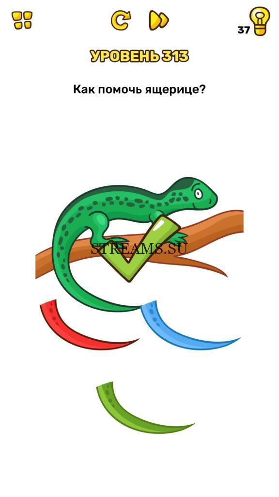 Как помочь ящерице? Уровень 313 — Brain Blow: Тест на гениальность — Ответ на этот уровень находится под фото. Очередная игра от популярных разработчиков головоломок CASUAL AZUR GAMES. Если вы хотите взорвать свой мозг и развить навыки нестандартного мышления, тогда игра Брейн Блоу определенно вам понравится. Если не получается решить задание, то попробуйте включить нестандартное мышление, тряхнуть телефон, погладить его или использовать больше пальцев. Эта игра способна развить в вас навыки следопыта, креативность и прокачать ваш IQ. Но, а если все-же не получается пройти уровень, найдите правильное решение на нашем сайте.