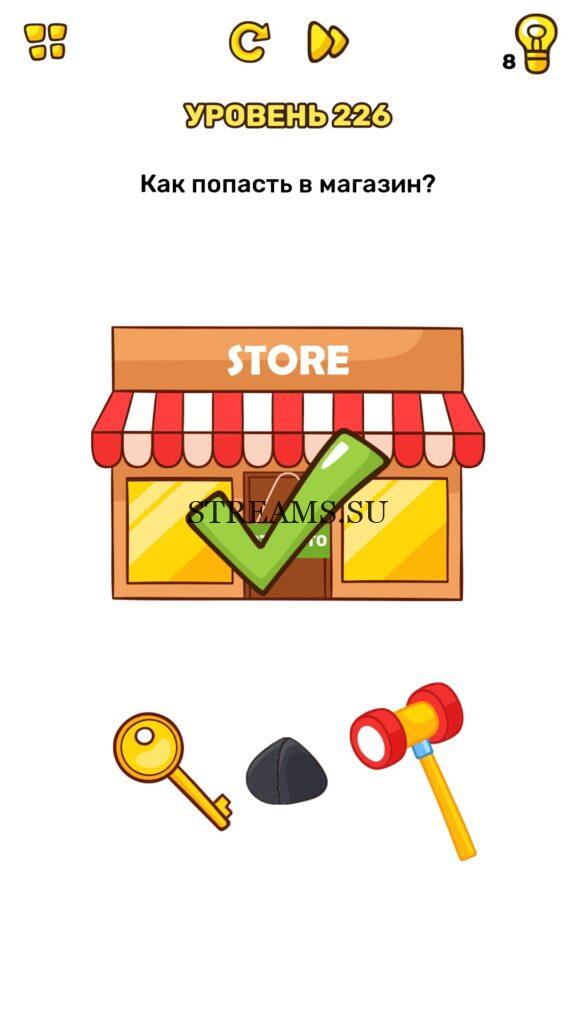 Как попасть в магазин? Уровень 226 — Brain Blow: Тест на гениальность — Ответ на этот уровень находится под фото. Очередная игра от популярных разработчиков головоломок CASUAL AZUR GAMES. Если вы хотите взорвать свой мозг и развить навыки нестандартного мышления, тогда игра Брейн Блоу определенно вам понравится. Если не получается решить задание, то попробуйте включить нестандартное мышление, тряхнуть телефон, погладить его или использовать больше пальцев. Эта игра способна развить в вас навыки следопыта, креативность и прокачать ваш IQ. Но, а если все-же не получается пройти уровень, найдите правильное решение на нашем сайте.
