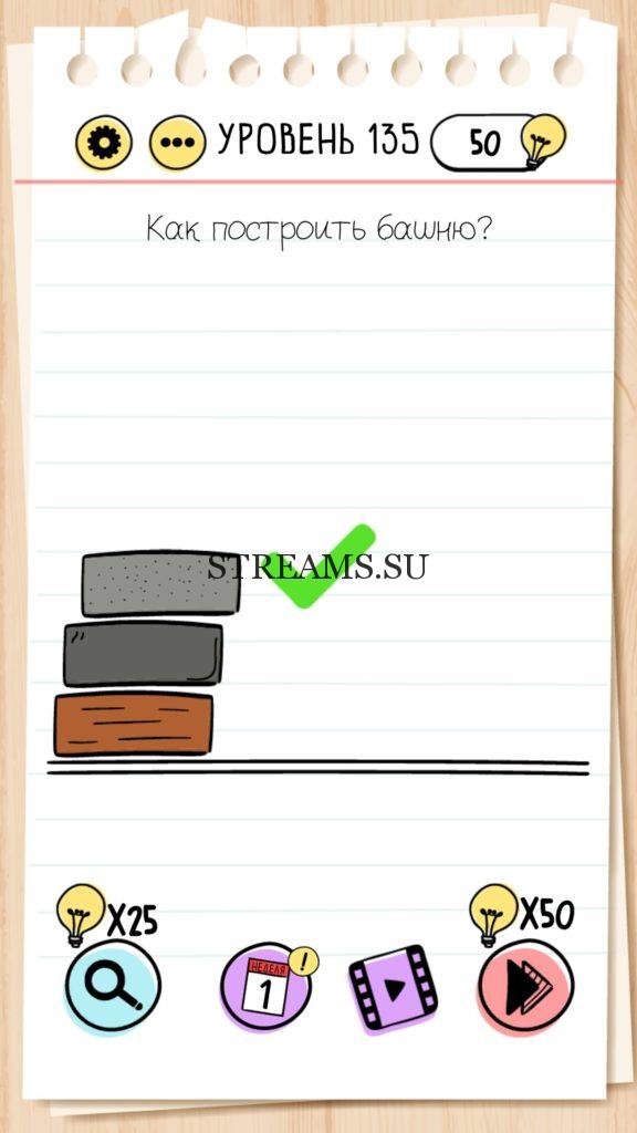 Как построить башню? Уровень 135 — Brain Test— Это самая популярная головоломка, в которой вам предстоит разгадывать непростые задачки. Нужно будет искать нестандартные решения. Название игры говорит само за себя (Тест мозга). С её помощью вы сможете повысить свой IQ, и интеллект. Иногда ответ может быть очень прост. Вы можете играть в компании друзей или родных. Брейн Тест, это отличный способ провести время с пользой и узнать насколько ты умный. Но если вы не можете решить один или несколько уровней, то воспользуйтесь подсказками с нашего сайта.