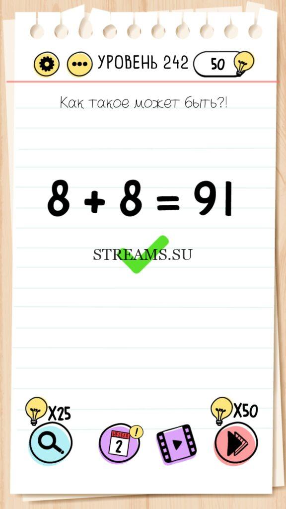 Как такое может быть?! Уровень 242 — Brain Test — Это самая популярная головоломка, в которой вам предстоит разгадывать непростые задачки. Нужно будет искать нестандартные решения. Название игры говорит само за себя (Тест мозга). С её помощью вы сможете повысить свой IQ, и интеллект. Иногда ответ может быть очень прост. Вы можете играть в компании друзей или родных. Брейн Тест, это отличный способ провести время с пользой и узнать насколько ты умный. Но если вы не можете решить один или несколько уровней, то воспользуйтесь подсказками с нашего сайта.