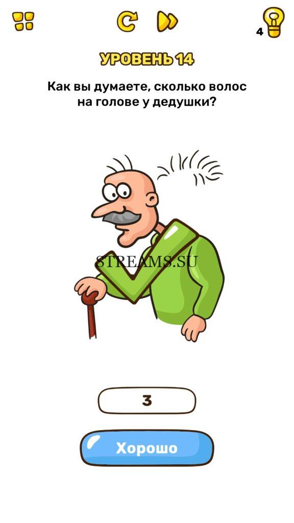 Как вы думаете, сколько волос на голове у дедушки? Уровень 14 — Brain Blow: Тест на гениальность — Ответ на этот уровень находится под фото. Очередная игра от популярных разработчиков головоломок CASUAL AZUR GAMES. Если вы хотите взорвать свой мозг и развить навыки нестандартного мышления, тогда игра Брейн Блоу определенно вам понравится. Если не получается решить задание, то попробуйте включить нестандартное мышление, тряхнуть телефон, погладить его или использовать больше пальцев. Эта игра способна развить в вас навыки следопыта, креативность и прокачать ваш IQ. Но, а если все-же не получается пройти уровень, найдите правильное решение на нашем сайте.
