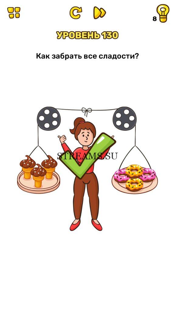 Как забрать все сладости? Уровень 130 — Brain Blow: Тест на гениальность — Ответ на этот уровень находится под фото. Очередная игра от популярных разработчиков головоломок CASUAL AZUR GAMES. Если вы хотите взорвать свой мозг и развить навыки нестандартного мышления, тогда игра Брейн Блоу определенно вам понравится. Если не получается решить задание, то попробуйте включить нестандартное мышление, тряхнуть телефон, погладить его или использовать больше пальцев. Эта игра способна развить в вас навыки следопыта, креативность и прокачать ваш IQ. Но, а если все-же не получается пройти уровень, найдите правильное решение на нашем сайте.