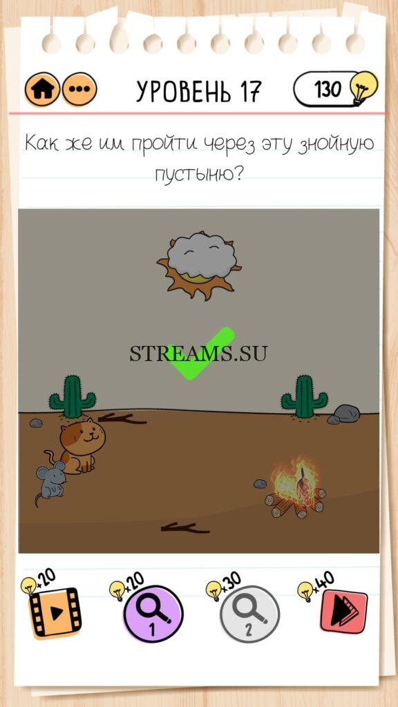 Как же им пройти через знойную пустыню? Уровень 17 — Brain Test 2 (Приключения Васьки): Вторая часть замечательной игры уже здесь. Готовы к испытанию своего мозга на прочность? Тогда смело залетайте в эту головоломку. Здесь нас ждет непредсказуемые задачки, вопросы и головоломки, которые сразу и не получиться решить. Будьте готовы к вопросам с подвохом! Попробуйте решить все уровни. Эта головоломка построена по принципу историй. В каждой истории придется помогать кому-то решить бытовые вопросы; вычислить преступника; помочь похудеть. Это лишь некоторые эпизоды которые нас ожидают в этой игре. Очень красочная игра, которая понравится и вам и вашим друзьям. Если не получается пройти загадку, то на нашем сайте STREAMS.SU вы найдете решение любого уровня Brain Test 2!