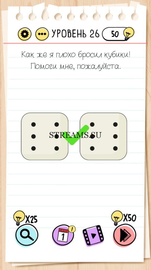 Как же я плохо бросил кубики! Помоги мне, пожалуйста. Уровень 26 — Brain Test — Это самая популярная головоломка, в которой вам предстоит разгадывать непростые задачки. Нужно будет искать нестандартные решения. Название игры говорит само за себя (Тест мозга). С её помощью вы сможете повысить свой IQ, и интеллект. Иногда ответ может быть очень прост. Вы можете играть в компании друзей или родных. Брейн Тест, это отличный способ провести время с пользой и узнать насколько ты умный. Но если вы не можете решить один или несколько уровней, то воспользуйтесь подсказками с нашего сайта.