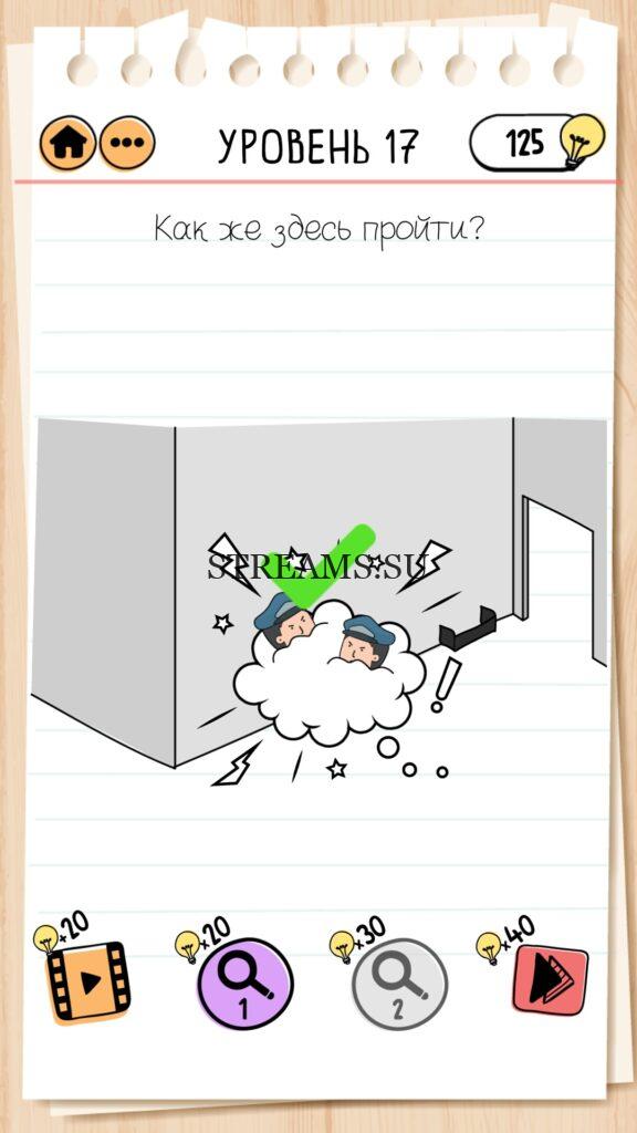Как же здесь пройти? Уровень 17 — Brain Test 2 (Побег из тюрьмы): Вторая часть замечательной игры уже здесь. Готовы к испытанию своего мозга на прочность? Тогда смело залетайте в эту головоломку. Здесь нас ждет непредсказуемые задачки, вопросы и головоломки, которые сразу и не получиться решить. Будьте готовы к вопросам с подвохом! Попробуйте решить все уровни. Эта головоломка построена по принципу историй. В каждой истории придется помогать кому-то решить бытовые вопросы; вычислить преступника; помочь похудеть. Это лишь некоторые эпизоды которые нас ожидают в этой игре. Очень красочная игра, которая понравится и вам и вашим друзьям. Если не получается пройти загадку, то на нашем сайте STREAMS.SU вы найдете решение любого уровня Brain Test 2!