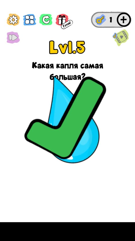 Какая капля самая большая? 5 уровень Trick Me: логические головоломки — Это игра созданная в виде викторины. Каждый новый уровень отличается от предыдущего, что делает игровой процесс затягивающим и интересным. Если ты хочешь узнать насколько ты умный, тогда эта игра точно для тебя! Trick Me поможет тебе развить нестандартное мышление, и повысить свой IQ. В этой игре уже есть 236 уровней, которые постоянно обновляются и пополняются. Но если застрял на одном или нескольких уровнях, и не можешь их пройти, то наш сайт придет на помощь, у нас есть все ответы на уровни игры Trick Me.