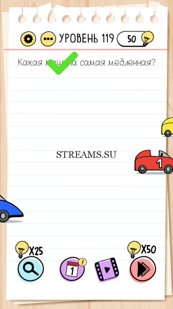 Какая машина самая медленная? Уровень 119 — Brain Test— Это самая популярная головоломка, в которой вам предстоит разгадывать непростые задачки. Нужно будет искать нестандартные решения. Название игры говорит само за себя (Тест мозга). С её помощью вы сможете повысить свой IQ, и интеллект. Иногда ответ может быть очень прост. Вы можете играть в компании друзей или родных. Брейн Тест, это отличный способ провести время с пользой и узнать насколько ты умный. Но если вы не можете решить один или несколько уровней, то воспользуйтесь подсказками с нашего сайта.