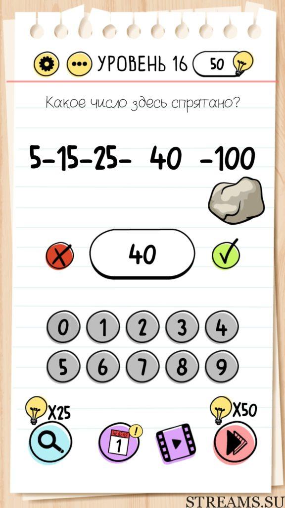 Какое число здесь спрятано? Уровень 16 — Brain Test — Это самая популярная головоломка, в которой вам предстоит разгадывать непростые задачки. Нужно будет искать нестандартные решения. Название игры говорит само за себя (Тест мозга). С её помощью вы сможете повысить свой IQ, и интеллект. Иногда ответ может быть очень прост. Вы можете играть в компании друзей или родных. Брейн Тест, это отличный способ провести время с пользой и узнать насколько ты умный. Но если вы не можете решить один или несколько уровней, то воспользуйтесь подсказками с нашего сайта.