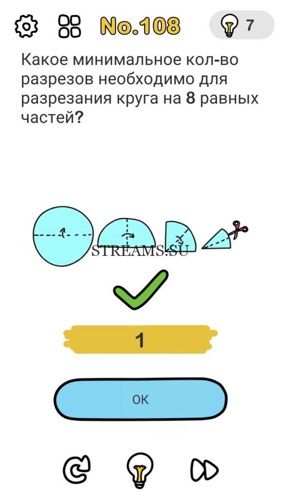 Какое минимальное кол-во разрезов необходимо для разрезания круга на 8 равных частей? Уровень 108 — Brain Out: Ответ на этот уровень находится чуть ниже. Всегда было интересно узнать каков твой IQ? Эта игра поможет тебе узнать ответ на этот вопрос! В ней встречаются как логические загадки, так и не очень. С помощью этой интересной головоломки вы сможете развить нестандартное мышление, креативность, воображение а также улучшить способность запоминать. Некоторые решения задач, могут показаться абсурдными. Играйте в Brain Out с друзьями и родственниками. А если у вас не получается пройти один или несколько уровней, вы можете воспользоваться подсказками с нашего сайта.