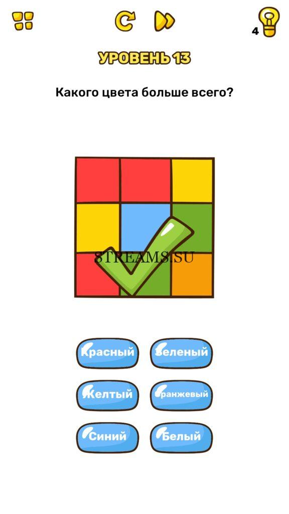 Какого цвета больше всего? Уровень 13 — Brain Blow: Тест на гениальность — Ответ на этот уровень находится под фото. Очередная игра от популярных разработчиков головоломок CASUAL AZUR GAMES. Если вы хотите взорвать свой мозг и развить навыки нестандартного мышления, тогда игра Брейн Блоу определенно вам понравится. Если не получается решить задание, то попробуйте включить нестандартное мышление, тряхнуть телефон, погладить его или использовать больше пальцев. Эта игра способна развить в вас навыки следопыта, креативность и прокачать ваш IQ. Но, а если все-же не получается пройти уровень, найдите правильное решение на нашем сайте.