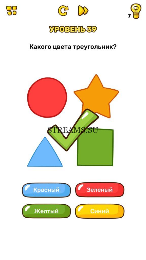 Какого цвета треугольник? Уровень 39 — Brain Blow: Тест на гениальность — Ответ на этот уровень находится под фото. Очередная игра от популярных разработчиков головоломок CASUAL AZUR GAMES. Если вы хотите взорвать свой мозг и развить навыки нестандартного мышления, тогда игра Брейн Блоу определенно вам понравится. Если не получается решить задание, то попробуйте включить нестандартное мышление, тряхнуть телефон, погладить его или использовать больше пальцев. Эта игра способна развить в вас навыки следопыта, креативность и прокачать ваш IQ. Но, а если все-же не получается пройти уровень, найдите правильное решение на нашем сайте.