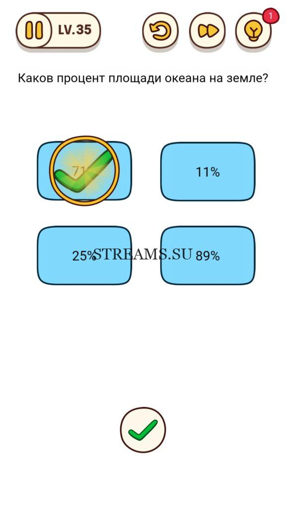 Каков процент площади океана на земле? Уровень 35 — Brain Find– игра для любителей подумать над интересными задачами, ответ на этот уровень находится чуть ниже. Нужно включить собственное остроумие. Эта игра дает возможность увидеть множество локаций и разгадать бесконечное количество ребусов. Каждый отличается друг от друга. Создатели игры – «Focus apps» вложили не только материальные средства, но и всю любовь к игрокам. Ведь в приложении достаточно совершенная прорисовка, радующая глаз. Главным преимуществом является поддержка как Android так и IOS. Нередко бывает, что человек, проходящий уровень, не способен его решить (задача слишком сложна или непонятна). Наш сайт с ответами поможет игроку достичь вершин рейтинга и заполучить все бонусы.