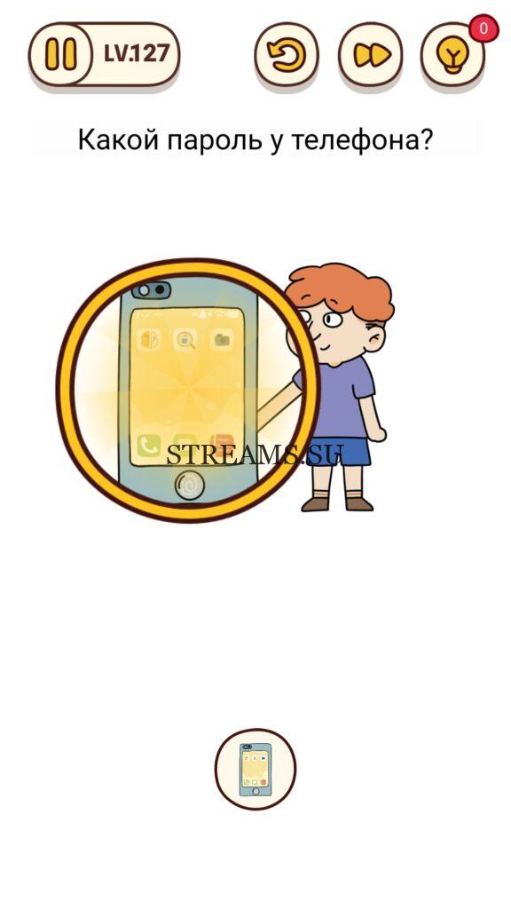 Какой пароль у телефона? Уровень 127 — Brain Find – уникальная игра в жанре «головоломка», ответ находится чуть ниже. Она имеет множество уровней и подуровней, которые весело проходить, без особых усилий и траты нервов. Игра нравится многим пользователям из-за приятного музыкального ряда, сопровождающегося весь игровой процесс. Тонко выполненной анимации и красивой графики, над которой поработали разработчики и вложили душу. Уникальность проекта состоит в том, что можно поворачивать экран на некоторых заданиях, увеличивать громкость динамика. То есть, всецело взаимодействовать не только с дисплеем, но и со всем мобильным устройством. На данный момент таких игр мало и не все они доступны в бесплатной версии! Brain Find переведена на русский язык. На нашем сайте, можно получить подсказки, если не получается пройти дальше.