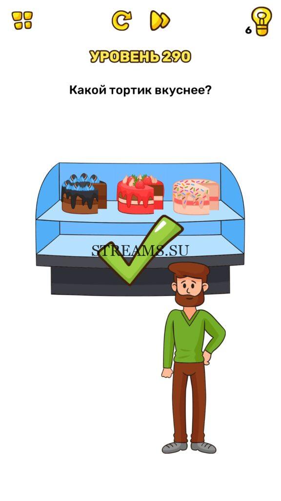 Какой тортик вкуснее? Уровень 290 — Brain Blow: Тест на гениальность — Ответ на этот уровень находится под фото. Очередная игра от популярных разработчиков головоломок CASUAL AZUR GAMES. Если вы хотите взорвать свой мозг и развить навыки нестандартного мышления, тогда игра Брейн Блоу определенно вам понравится. Если не получается решить задание, то попробуйте включить нестандартное мышление, тряхнуть телефон, погладить его или использовать больше пальцев. Эта игра способна развить в вас навыки следопыта, креативность и прокачать ваш IQ. Но, а если все-же не получается пройти уровень, найдите правильное решение на нашем сайте.